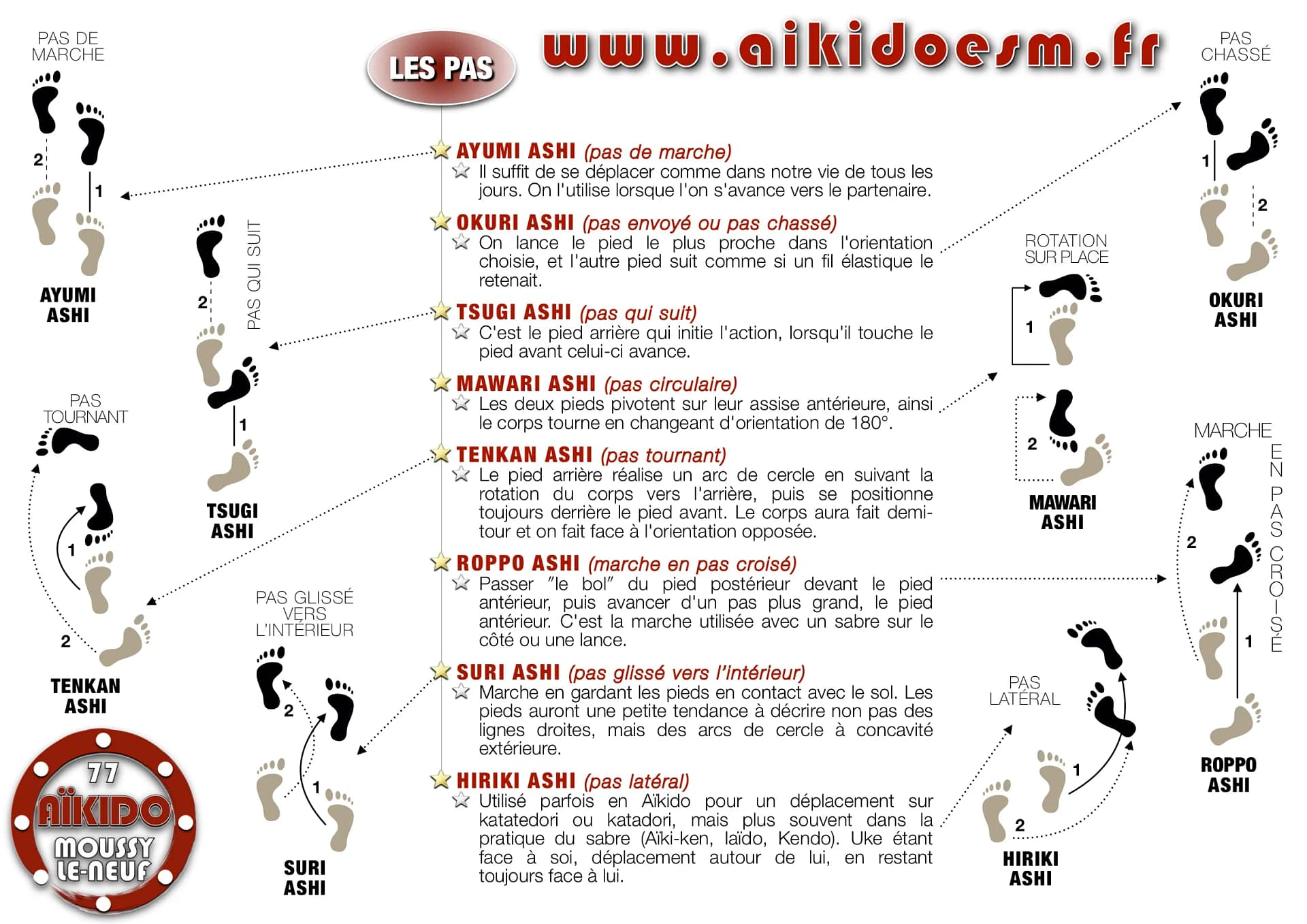 - Tsugi ashi : un pas chassé ou presque. La jambe arrière est moteur.
