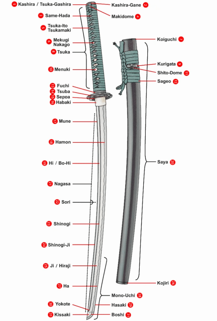 Avec un katana, la coupe se fait uniquement avec les dix premiers centimètres de la lame, partie appelée monouchi (物打), littéralement « objet qui frappe ». Lorsqu’il est manié seul (cas général), le katana se tient à deux mains ; l’exception la plus notable est l’école Hyoho Niten Ichi Ryu, où l’on utilise simultanément les deux sabres.