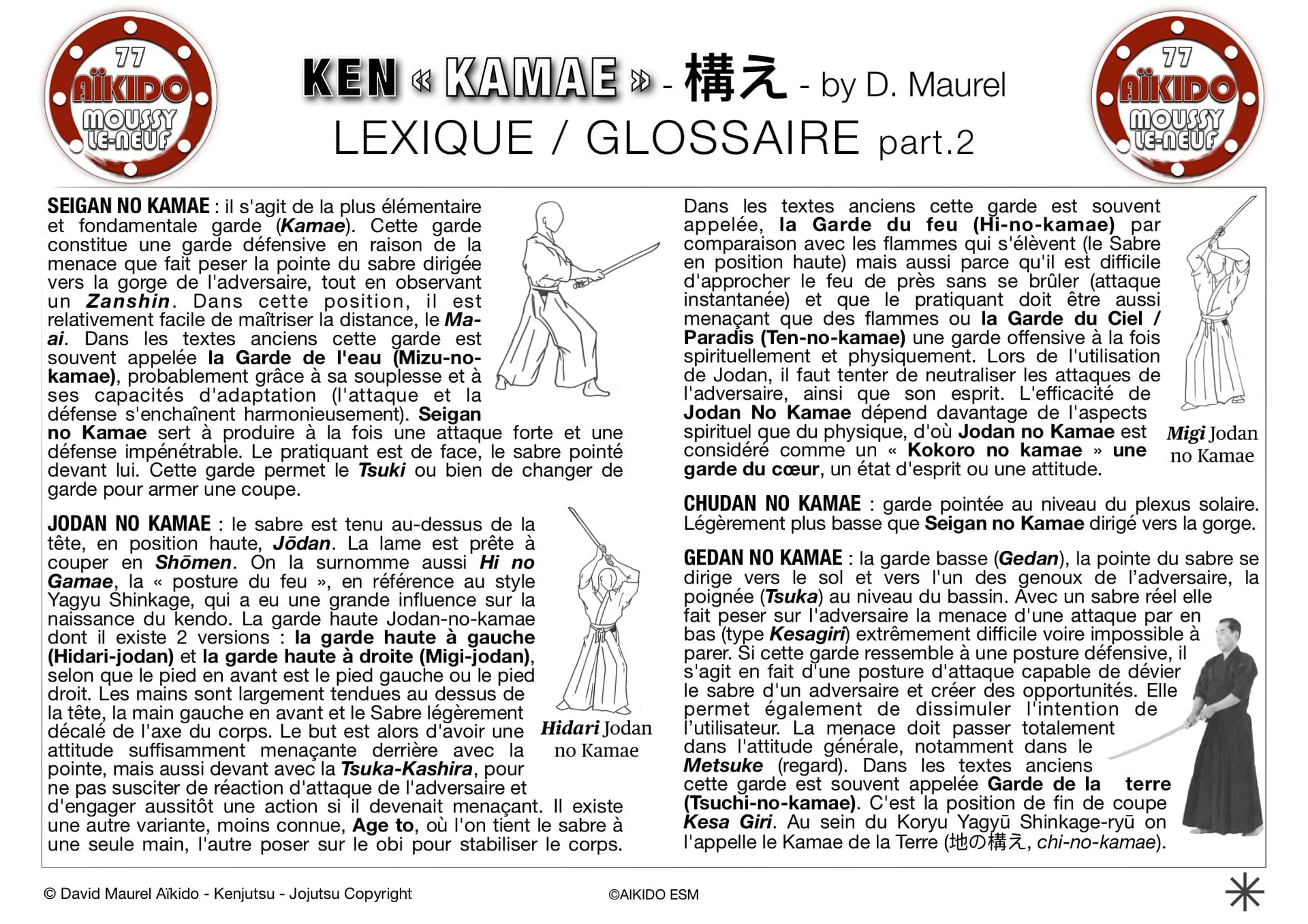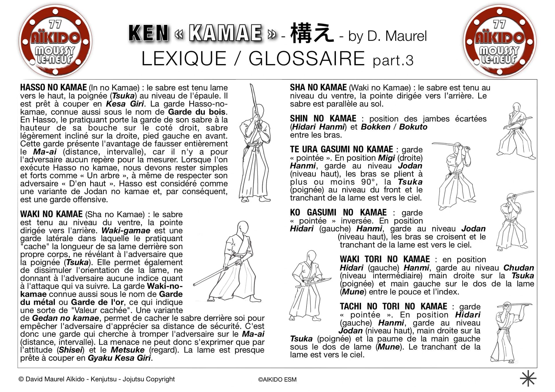 - Gedan no kamae : position basse, gedan. Le sabre est tenu en bas, tranchant vers le bas, la poignée au niveau du bassin. C’est la position de fin de coupe kesa giri.