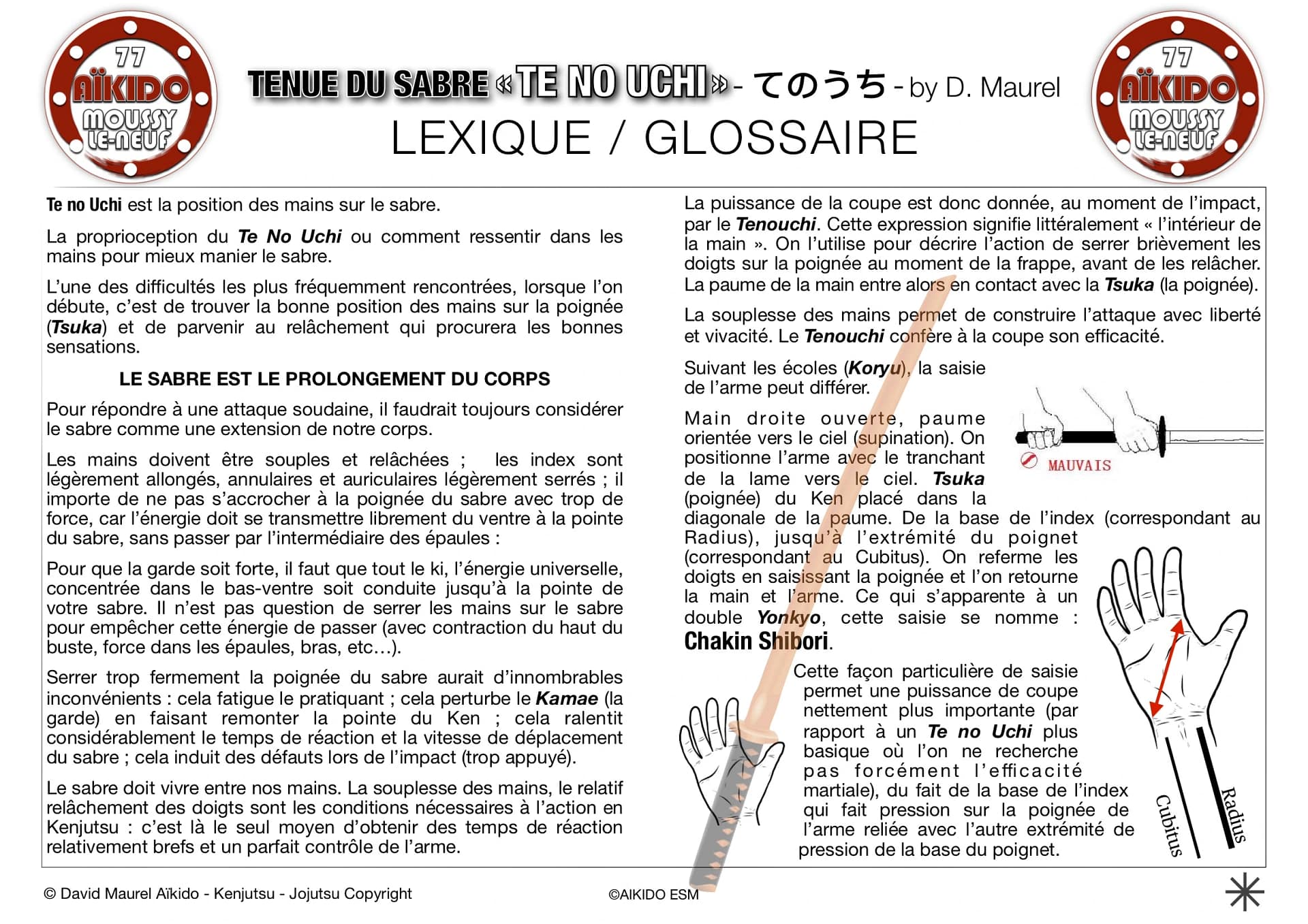 On peut déplacer aisément les mains sur la tsuka, couper à une main ou deux selon des techniques et les circonstances. Lorsqu’on coupe un adversaire, il faut avoir un te no uchi ferme en serrant les petits doigts, sinon on ne coupe pas. On utilise le te no uchi enseigné par l’école.