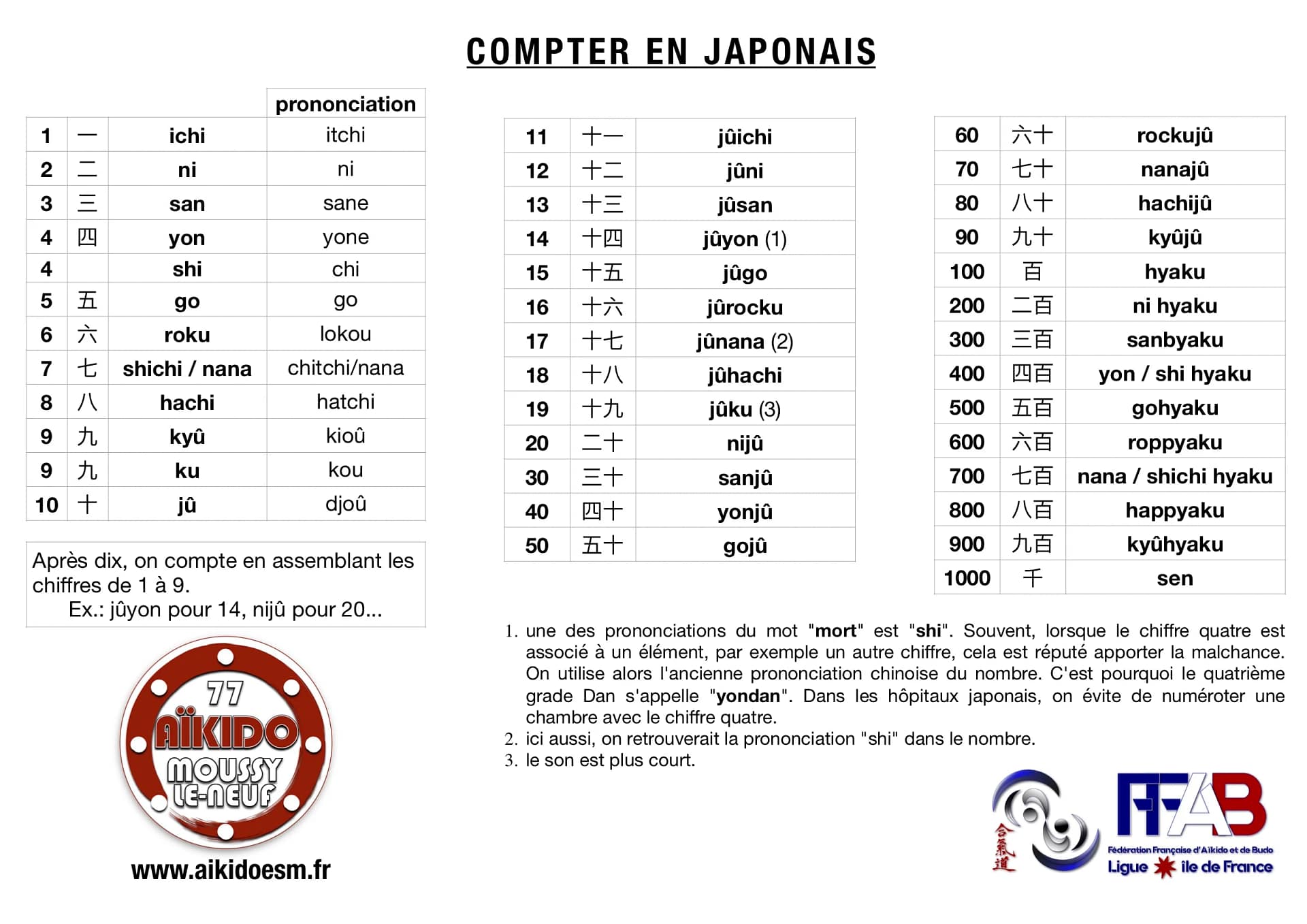 | Yon – 四 Chiffre quatre (4). Yon : 四. Prononciation : yone. Autre appellation : Shi. Une des prononciations du mot « mort » est « shi ». Souvent, lorsque le chiffre quatre est associé à un élément, par exemple un autre chiffre, cela est réputé apporter la malchance. On utilise alors l’ancienne prononciation chinoise du nombre. C’est pourquoi le quatrième grade Dan s’appelle « yondan ». Dans les hôpitaux japonais, on évite de numéroter une chambre avec le chiffre quatre | |||