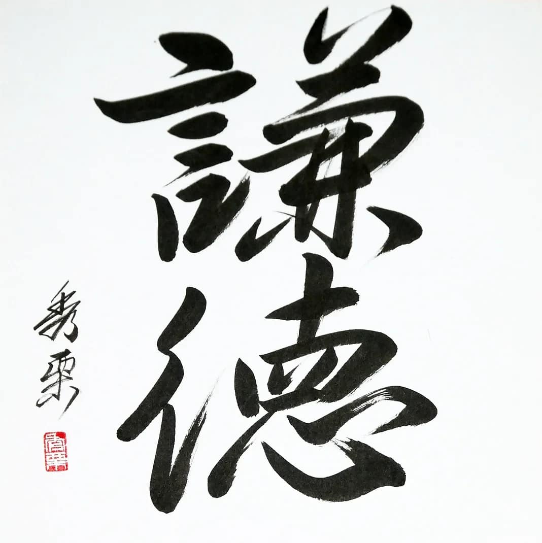 Ci-dessus, calligraphie de Pascal Krieger : Kentoku (humilité, modestie).