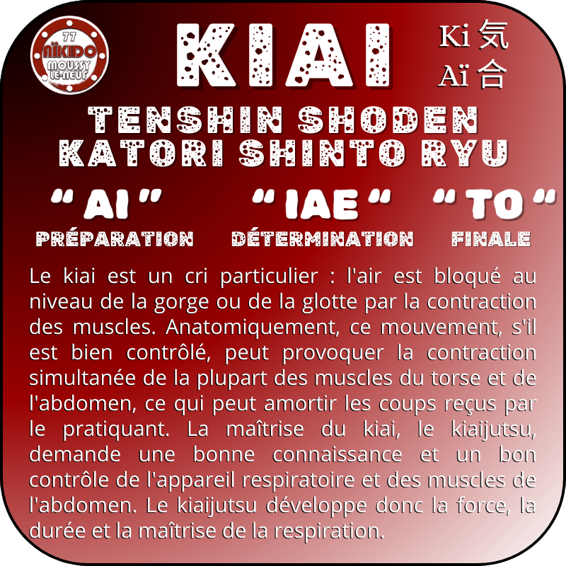 Le KIAI est donc une extension énergétique de l’extériorisation d’un cri interne, du souffle-énergie KI (kokyu-ryokyu) accompagnant un mouvement martial.